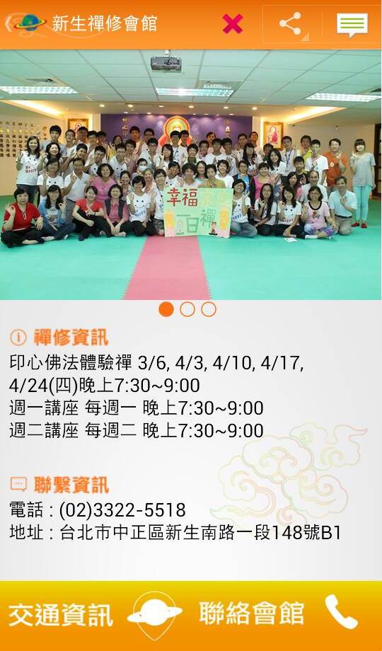 • 提供全省禪修會館之資訊,含最新講座、活動、地址、電話等。